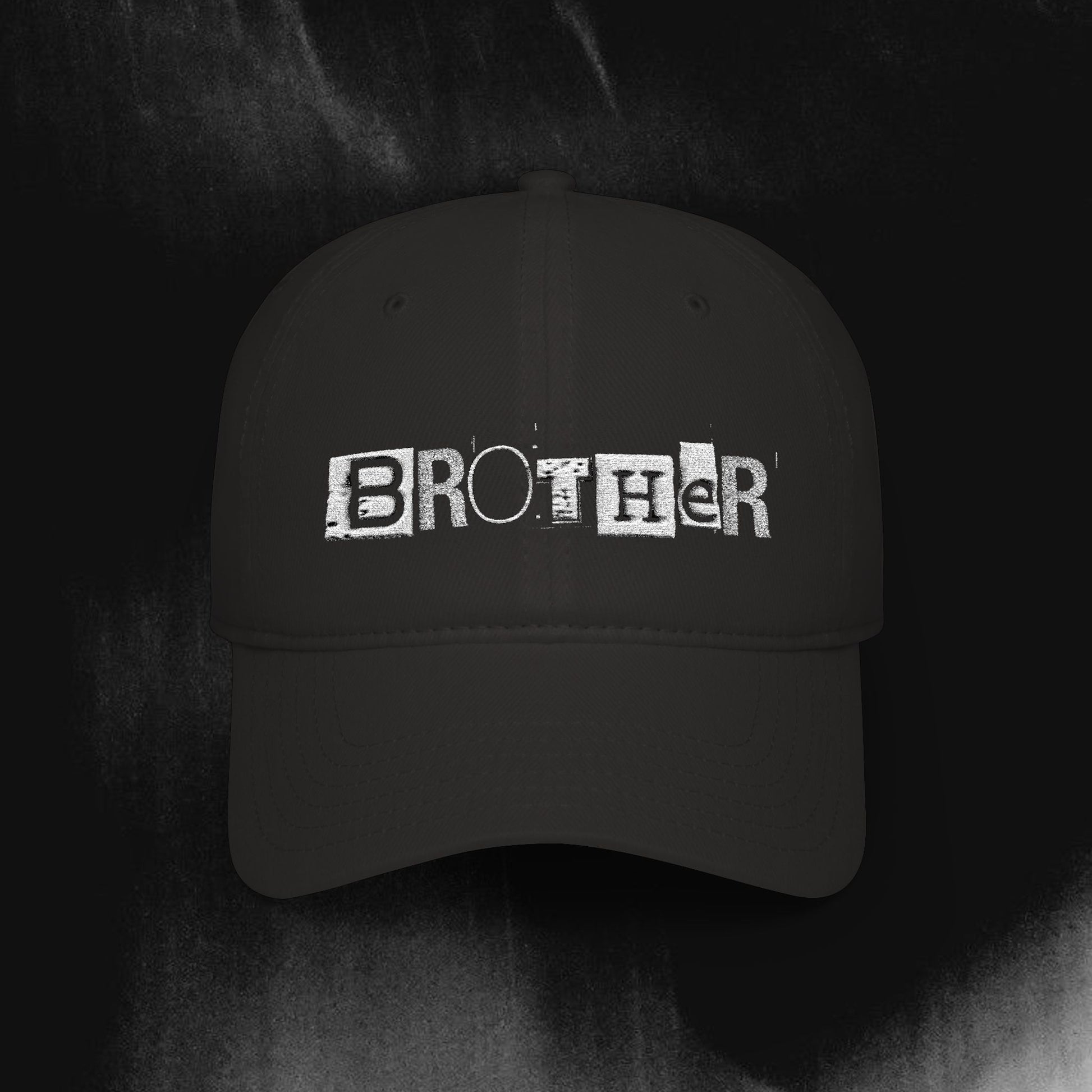A low-profile baseball cap with a raw, DIY attitude — black cotton twill softened for a close, comfortable fit. The front features distressed, ransom-style lettering that reads “BROTHER,” giving the cap a gritty, lived-in vibe. Wear it to quiet down an outfit or to add a personal, rebellious touch to weekend plans. It sits low on the head, tucks easily under a hood, and the adjustable Velcro® closure lets you tweak the fit without fuss. Small embroidered detail at the back echoes the front’s hand-made look so the design reads from every angle.